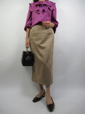 フリル襟が多い今季ですが、このくらいのフリルなら大人でも上手く着こなせます。ポイントはタイトのスカートでシックにまとめるのがコツ!エレガンス度60%、フェミニン度40%。