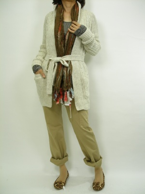 ロングカーデェと綿パンで大人の休日スタイルに。パンツの裾はロールアップで足首を見せて、ぺたんこ靴を合わせるのがお決まりです!アクティブ度100%。
