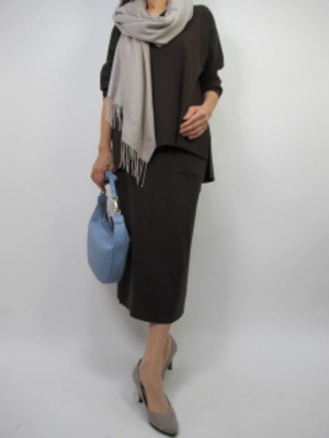 タイトスカートとのニットアンサンブル。ベーシックな大人の装いです。トップスはV字ネックでとてもオシャレです。サラッとしたウールが入っていないニットなので肌に優しく着心地もよく、品のあるアンサンブルです!エレガンス度60%、フェミニン度40%。