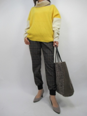 流行りのジョッガーパンツもチャック柄だと、とても新鮮。配色ニットで今どきコーデにチャレンジして、スタイリッシュな秋コーデに仕上げました!スタイリッシュ度60%、カジュアル度40%。
