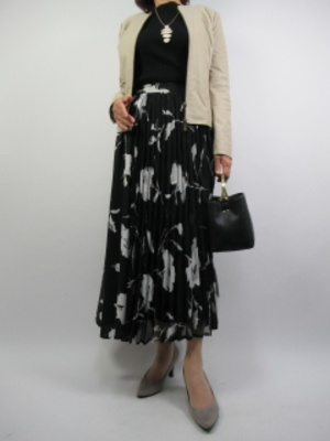 皮革のハード感が色とデザインによってとてもエレガンスになる。ジャケットを女らしく花柄スカートで着こなす。甘辛のバランスも程よくとれたエレガントな大人のお出かけコーデ!エレガンス度70%、スタイリッシュ度30%。
