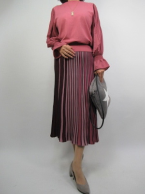 ニットのプリーツスカートはボルドーやピンクなどの配色を用いたスカートです。その中の一色をトップスのニットにリンクしてセットアップのように着こなして見ました!フェミニン度60%、エレガンス度40%。