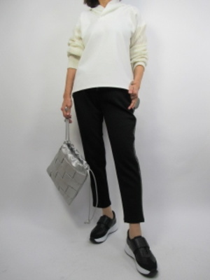スポーティなパンツとパーカ。色違いで合わせてみました。パンツの脇ラインがシルバーでとてもオシャレ。トップスも脇が異素材ですので、今までとちょっと違ったデイリーファッションを楽しめます!アクティブ度100%。