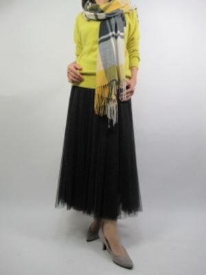 鮮やかなニットはフォックス系のふんわりニット。シンプルなデザインをチュールでおしゃれにコーデ。ポイントはイエロー系のストールをムビにアクセントとしてまとめました!フェミニンド60%、カジュアルド40%。