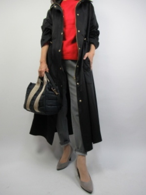 一枚でも完成するコートワンピースをデニムでコーディネートしてみる。黒×赤のコントラストが効いたメリハリのあるトップスも手伝ってオシャレなスタイリッシュコーデに!スタイリッシュ度70%、カジュアル度30%。