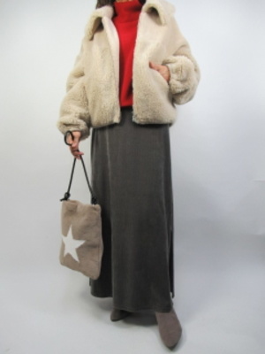 モコモコのボア生地のブルゾンは可愛くて出入りファッションにピッタリ合う。ロングスカートにプラスして普段のおしゃれにボリュームをつけたカジュアルコーデ!アクティブ度100%。