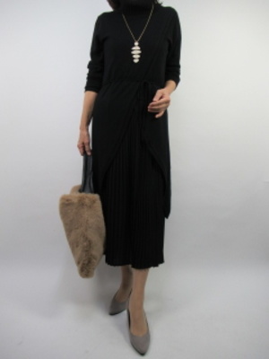 プリーツのインナーとニットのカットアップワンピース。一着でもとてもオシャレ感が出るワンピースは冬のお呼ばれにもOKな一着です。黒なので小物でアクセントを付けてエレガンスに!エレガンス度70%、フェミニン度30%。