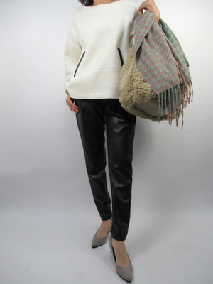 トップスはテント型の甘口カットソー素材は圧縮ウールのような厚みのある生地。ボトムスは黒のジョガーパンツで辛口スタイルに。白×黒のメリハリのある色合わせにアクセントのあるボアバッグで甘辛コーデに仕上げる!スタイリッシュ度60%、アクティブ度40%。
