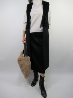 流行りのジレスタイル。黒とグレージュのベーシックな色で組み合わせてみました。ジレのファー使いがスタイリッシュなタイトスカートでよりオシャレ度の高い組み合わせです!スタイリッシュ度70%、エレガンス度30%。