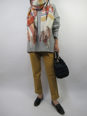 ざっくりしたニットはヒップまで隠れるので、腰回りを気にせずゆったりと着れるのが普段着には重要。パンツも裾が絞ったティーパー度なカジュアルパンツで合わせてみました!アクティブ度100%。