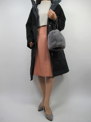 膝が隠れるくらいの短丈のスカートが久々に登場。エレガントなブラウスに合わせてコンサバスタイル。フード襟のコートも切り替えのデザインがおしゃれ!エレガンス度60%、フェミニン度40%。