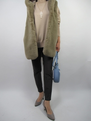 細身のパンツスタイルにざっくりスクエアタイプのニットでスタイリッシュに。その上にファージレで更に今どきのジレファッションに仕上げて!スタイリッシュ度70%、カジュアル度30%。