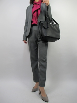 仕事を持っている方にオススメはパンツスーツ。きちんと感があり、ONのシーンには間違いの無いスタイル。グレー系なのであえてピンクのきれい色のブラウスをチョイスしてメリハリのあるコーデにしました!エレガンス度60%、スタイリッシュ度40%。