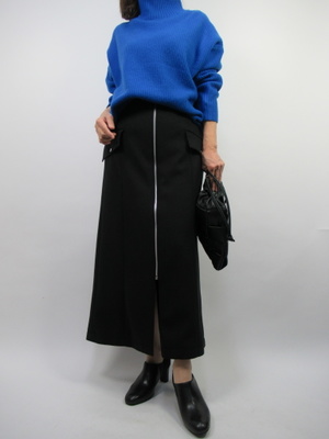 黒のタイトスカート。中心にシルバーのファスナーでポイントを付けた一着。黒に相性の良いブルーのニットでざっくりボリュームのあるシルエットなのでタイトスカートとのバランスは取れてよいコーデ!スタイリッシュ度60%、アクティブ度40%。