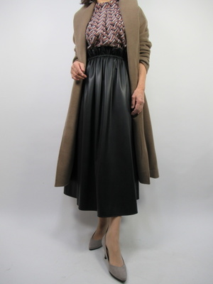 合皮のスカートはハードなイメージになりがちですが、ギャザーデザインなので女らしく着こなしせる一枚。ブラウスできちんとしたエレガントな装いになります!エレガンス度60%、スタイリッシュ度40%。