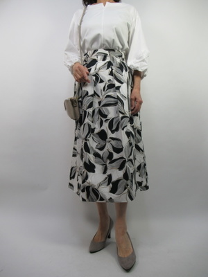 (白×黒でフェミニンコーデ)春らしい白のカットソーブラウスはお袖のフリルがキュートな1枚。ボタニカル柄のスカートは白黒なのでとても上品ですね。春を先取りしたフェミニンコーデ。