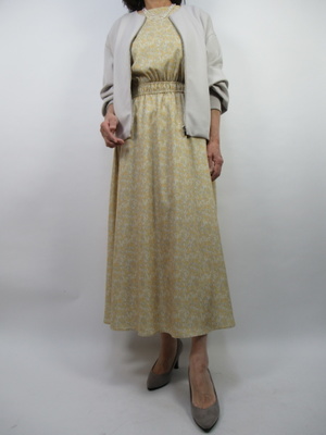 (淡い色の黄色のロングワンピース)ロングワンピースも淡い色の花柄なので重くなく軽やかなエレガントな1着です。トップスにカジュアルなジャケットを重ねてより軽さを表現。