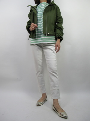 (コンパクトなブルゾンがおしゃれです)ボーダーカットソーに白のデニムは欠かせないコーデ。この季節はまだアウターが必須アイテム。今回は短丈のブルゾンでデイリーファッションをおしゃれにコーデ。