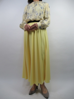 (黄色で春コーデ)春を感じる黄色をメインにしたコーデ。スカートの色より少し淡い色のブラウスに花柄のプリント模様で優しいトーンでまとめたコーデ。