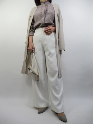 (着流しカーデでシンプルな大人スタイリング)白とベージュの優しい色で着こなす大人のシンプルスタイル。白のワイドパンツに着流しもカーディガンがよく似合う。