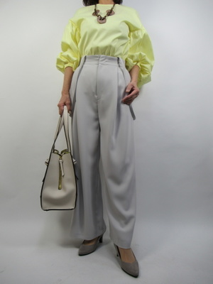 (春色のパステルトーンを全身に)淡い色の黄色いブラウスはボリューム袖でふわっとした印象に。ボトムスはとろみのある生地のワイドパンツ。淡いグレーがきいろとよく合う。サスペンダーは垂らしたままで。