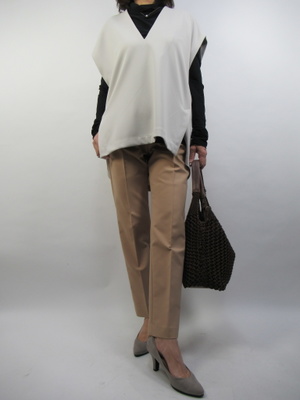 (おしゃれなレイヤードコーデ)重ね着に重宝な薄手のタートルにきれいめのベストでおしゃれに着こなす。センターライン入りのボトムスでシンプルなレイヤードコーデ。