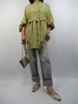 (グレー系デニムでデイリーをおしゃれに)グレーに黄色系のブラウスで大人っぽいデイリーコーデにしました。大きな襟が特徴のブラウスは今年顔ですね。春らしいトーンのカジュアルコーデ。