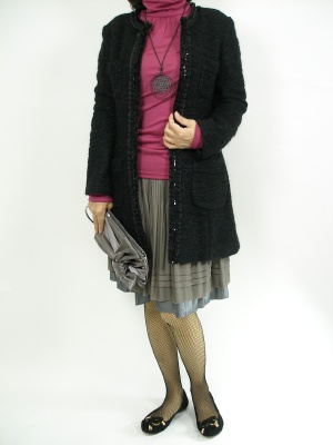 ラメツイードのコートやスカートの光沢感がとても上品なお出かけスタイル。インナーのローズピンクで大人のキュートを演出!エレガンス度90%、フェミニン度10%。