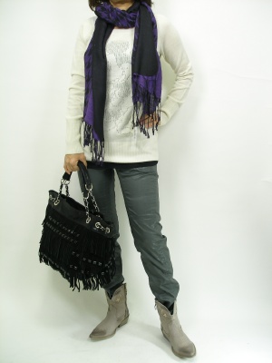 ミッキー柄のニットは可愛く、よりカッコよく着てみたい。ブーツとストールで少し男の子みたいに!スタイリッシュ度60%、アクティブ度40%。