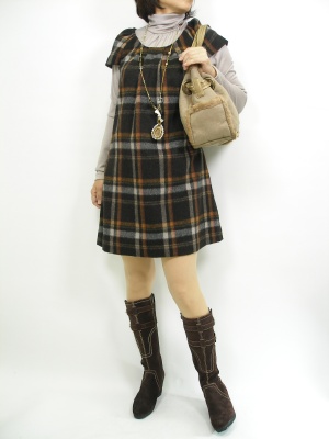 冬らしいチェックのワンピースは、やはりタートルを合わせて可愛く着たい。少しミニ丈なのでロングブーツと良く合います!フェミニン度100%。
