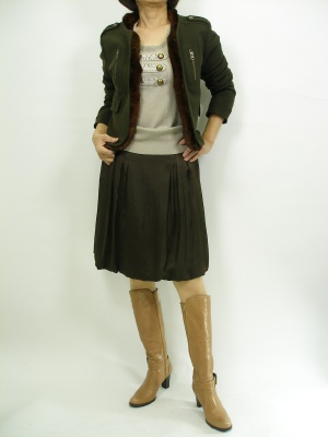 ミリタリー風のニットをバルーンスカートでソフトに仕上げました。通勤には流行りを程よく取り入れてみたいですね!スタイリッシュ度60%、フェミニン度40%。