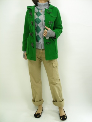ダッフルコートとアーガイルニットの正統派な着こなし。マカフィらしいグリーンが可愛いですね。パンツはロールアップして、少し崩してみて!アクティブ度90%、フェミニン度10%。