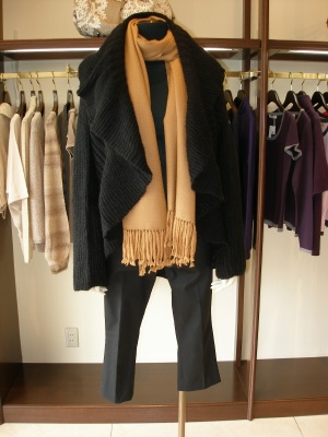 ニットカーディ。ボリューム感がありますが、モヘアを使用しているので、軽くて暖か。ロングブーツでもとてもお洒落です!スタイリッシュ度90%。フェミニン度10%。