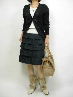 ロングカーディの丸みをおびたデザインとスカートのティアードがフェミニン度をアップしてくれます。ファー小物でより可愛らしさをアピール!フェミニン度100%。