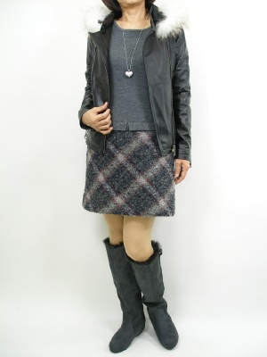 レザージャケットは甘口アイテムに合わせたいですね。ニットワンピとなら程よくガーリーに!フェミニン度70%、スタイリッシュ度30%。
