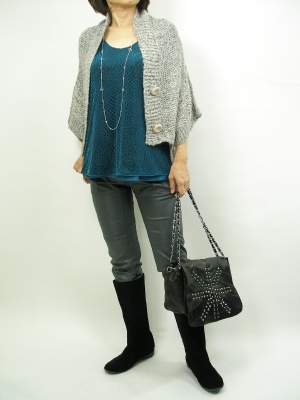 フェミニンなカットソーをざっくりカーデやハリのあるパンツで辛口に。全ての素材感をばらばらにしたものスッキリ見えるポイントです!スタイリッシュ度80%、フェミニン度20%。