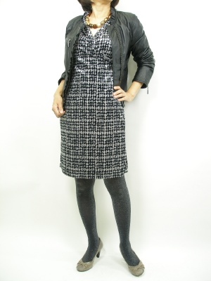 カシュクールワンピにフリルのレザージャケットでエレガントなカッコよさを演出。この場合足元はブーツよりパンプスが上品です!エレガンス度70%、スタイリッシュ度30%。