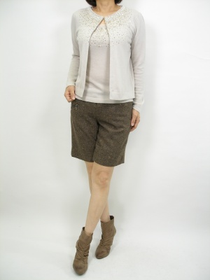 ちょっとしたお出かけにアンサンブルはやっぱり便利。膝丈スカートだとコンサバ過ぎるのでショートパンツにしてみました!フェミニン度90%、アクティブ度10%。