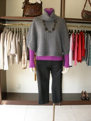 ニットポンチョをシックに大人っぽく。足元はヒールパンプスがバランスがいい!スタイリッシュ度90%、アクティブ度10%。