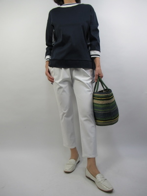 (白パンツはカジュアルにかかせない)休日はラフな装いで過ごしたい。白パンツはネイビーとの相性も良く、爽やかな着こなしになる。