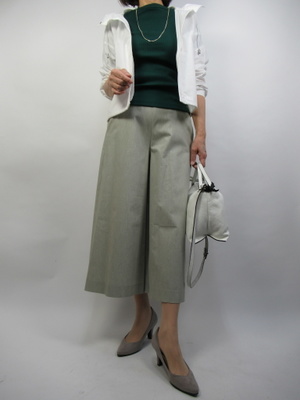 (ガウチョパンツもキレイ目ならお仕事にもOK)この丈のきれいめが欲しかったとのお声をよくいただきます。今回は待望のガウチョパンツ。しかも春色で登場。シンプルに組み合わせてONタイムにもOKなコーディネート。