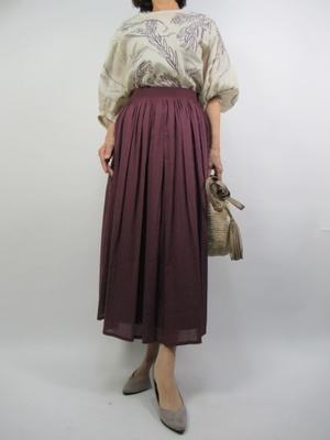 (パープルのスカートでフェミニンコーデ)落ち着いたパープルのお色がとても上品なロングスカート。トップスの刺繍のパープル色にリンクした大人かわいいコーデ。
