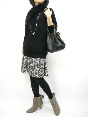 ニットとセットのゆるワンピをリボンのショートブーツでキュートに着こなして。ドルマンニットにはロングネックレスでアクセントを!フェミニン度90%、スタイリッシュ度10%。