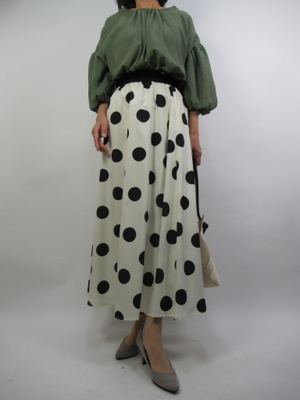 (ドット柄スカートで甘口コーデ)大きなドット柄のスカート。かなりインパクトがありますが白地なのでとても爽やかにうつる。トップスはカーキのフェミニンブラウスで甘口コーデ。