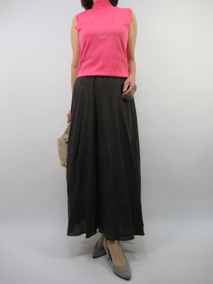 (麻もスカートでエレガントに)麻100%のマキシスカートはとてもエレガントですね。濃い茶色で大人っぽい印象に。相性の良いピンク色のニットで夏のお出かけコーデ。