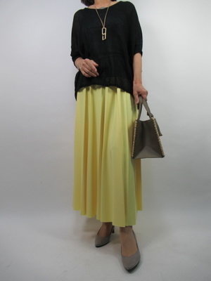 (ざっくりニットでフェミニンに)さっくりとしたニットはギャザースカートでゆるい感じで合わせてフェミニンコーデ。透け感があるので黒でも涼し気な1枚です。