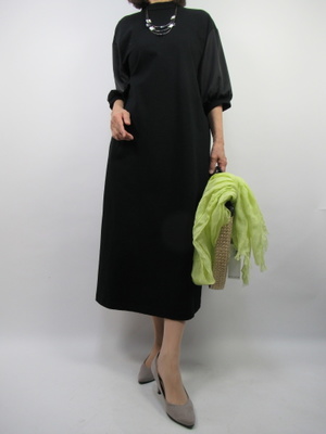 (カットソーの着やすいワンピース)カットソー地のとても着やすいワンピース。それも黒の半袖。大人っぽく着こなすには鮮やかなストールをアクセントに。バッグもおしゃれなかごバッグでお出かけコーデに。