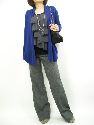 シックなモノトーンコーデには、ブルーのカーデをプラスして、新鮮な表情に。シンプルなのにオシャレに見えますよ!スタイリッシュ度90%、エレガンス度10%。