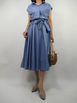 (コンサバスタイルのシャツワンピ)どことなく懐かしいシャツワンピース。ウェストサッシュベルトでスカートにボリュームを持たせてエレガントさを表現。爽やかなブルーにはカゴバックがよく映える。大人のエレガントな装い。