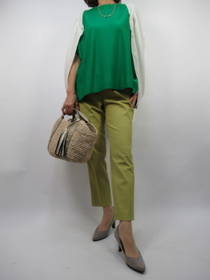 (鮮やかなグリーンのニットをポイントに)グリーン系のグラデーションでシンプルなパンツスタイルに。色鮮やかなトップスがポイント。アクセントに白のカーデを羽織って。